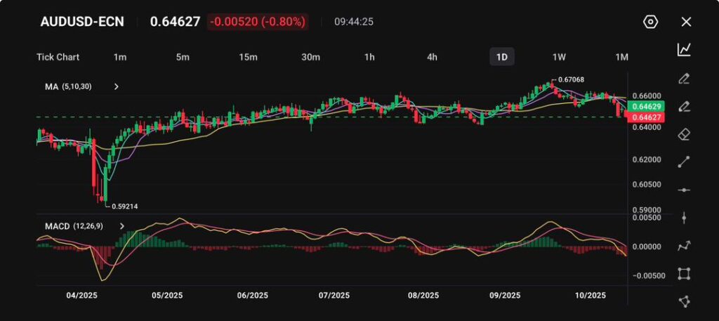 Pasangan AUD/USD diperdagangkan sekitar 0.6463, turun tajam sebesar 0.80%, seiring sentimen risiko memburuk dan dolar AS melanjutkan kenaikannya. Dollar Australia terus melemah di tengah harga komoditas yang lebih lembut, nada hati-hati dari RBA, dan kekhawatiran yang terus ada tentang pemulihan China yang lambat — faktor kunci yang mempengaruhi ekspor Australia.