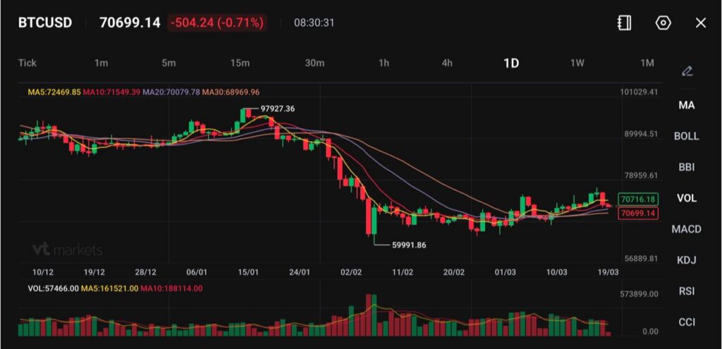 - BTCUSD diperdagangkan di sekitar 70.699, turun -504 (-0,71%), setelah turun lebih dari 5% dalam 24 jam.