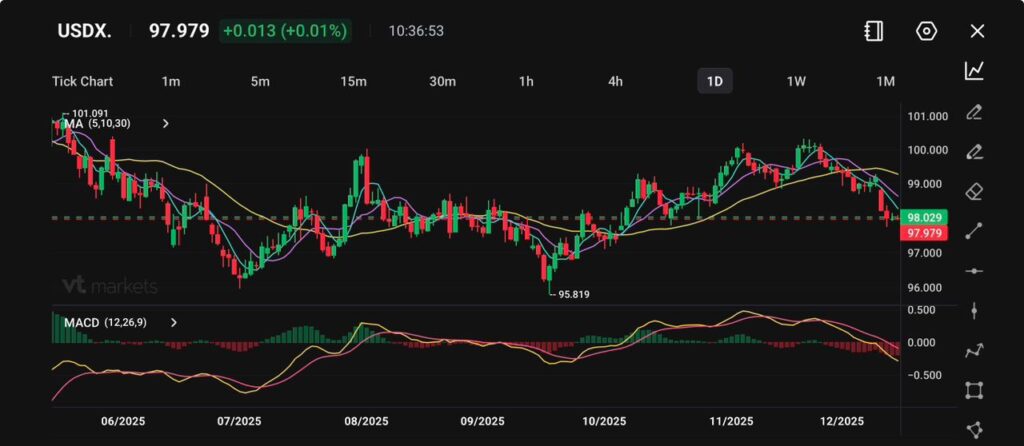 Indeks Dolar AS (USDX) terus mengalami penurunan pada hari Jumat, jatuh ke level terendah mendekati 98.134 dalam hampir dua bulan, saat pasar mencerna perubahan kebijakan terbaru dari Federal Reserve dan pengaruh politik yang semakin meningkat terhadap keputusan bank sentral.
