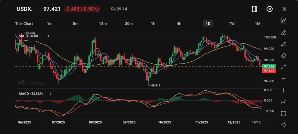 Ini menandakan pembalikan signifikan dari puncak sekitar 100.40 yang terlihat pada akhir November, yang sebagian besar dipicu oleh perubahan harapan suku bunga Fed dan selera pasar untuk risiko.