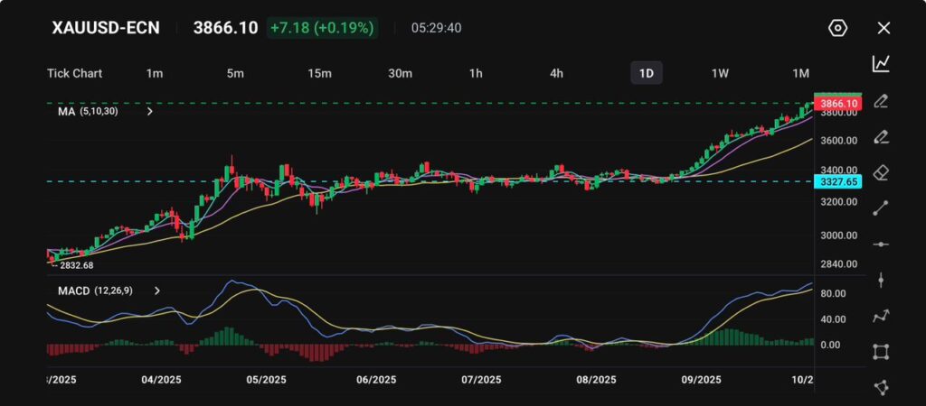 Emas (XAUUSD) melanjutkan tren naiknya, diperdagangkan pada $3,866.10, meningkat 0.19% hari ini, dan mencatatkan tingginya yang baru setelah reli kuat pada bulan September. Logam ini terus diuntungkan dari permintaan sebagai aset aman, momentum dolar AS yang lebih lemah, dan ekspektasi yang meningkat bahwa bank sentral akan mempertahankan kebijakan akomodatif hingga akhir tahun.