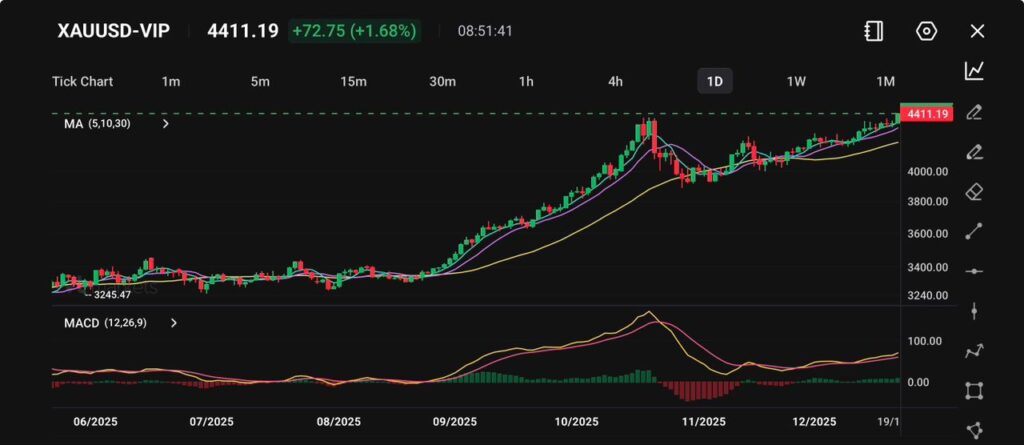 Harga emas melambung ke 4411,19, naik 1,68% pada hari itu, saat pembeli kembali mengambil alih dan mendorong logam kembali menuju rekor tertinggi baru-baru ini.