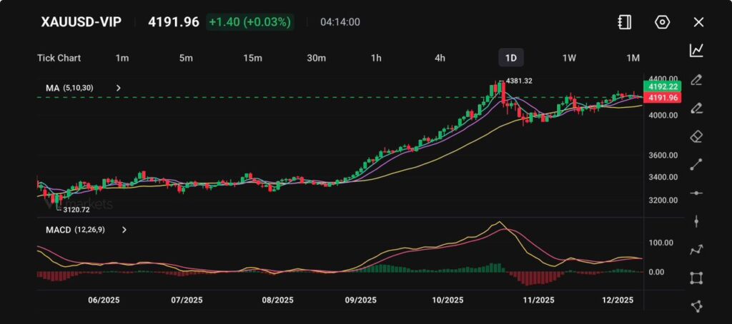 Emas diperdagangkan sekitar $4,191.96, tetap stabil dalam rentang konsolidasi yang ketat di bawah ketahanan kunci di $4,220 dan tidak jauh dari level tertinggi baru-baru ini di $4,381.32.