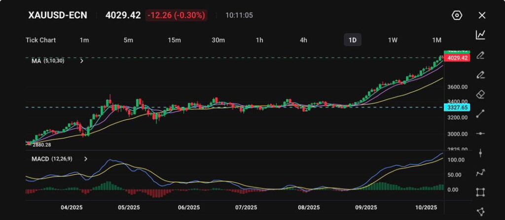Emas (XAU/USD) diperdagangkan sekitar $4,029.42, turun 0,30% pada hari itu setelah sempat mencapai titik tertinggi baru lebih awal minggu ini. Reli terbaru dari logam ini menunjukkan tanda-tanda pendinginan, dengan pedagang mengamankan keuntungan dekat zona resistensi psikologis $4,050–$4,100.