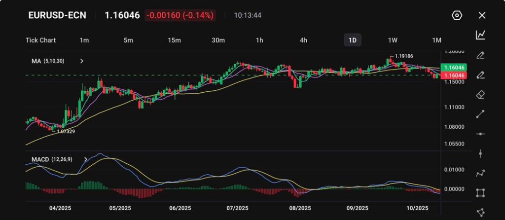 Pasing EUR/USD diperdagangkan sekitar 1,16046, sedikit lebih rendah 0,14%, saat euro terus berkonsolidasi dekat level terendahnya di tengah kekuatan dolar dan data bercampur dari zona euro. Pairs ini tetap berada di bawah tekanan jual yang moderat, dengan trader mempertimbangkan nada hati-hati Bank Sentral Eropa terhadap komitmen Federal Reserve untuk mempertahankan suku bunga tinggi lebih lama.