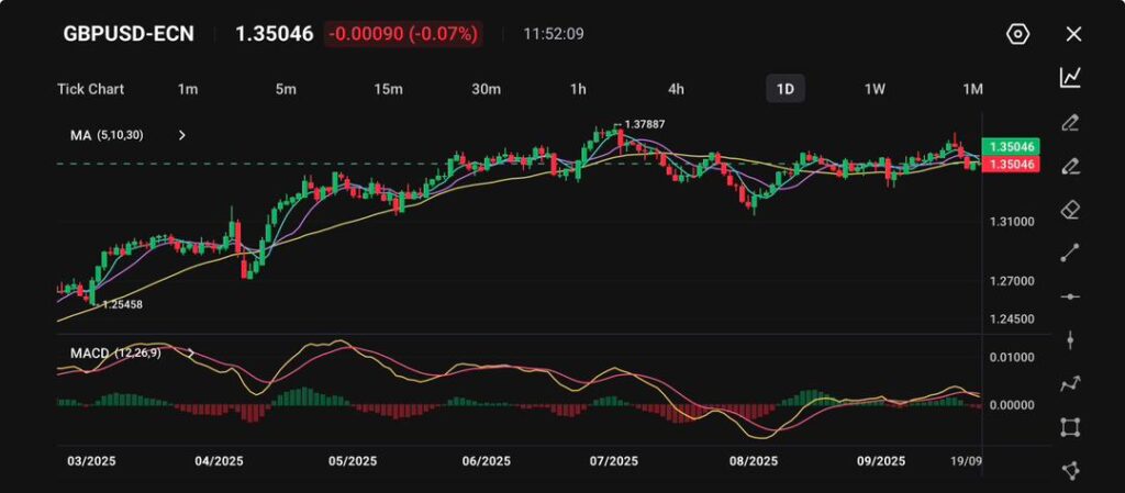 GBP/USD saat ini diperdagangkan di 1.3505, turun sedikit 0.07% hari ini, menunjukkan keraguan setelah kenaikan baru-baru ini. Pasangan mata uang ini telah berkonsolidasi dalam kisaran setelah memuncak di 1.3789 pada bulan Juli, dengan pergerakan harga kini mendekati titik tengah dari struktur yang lebih luas tersebut.