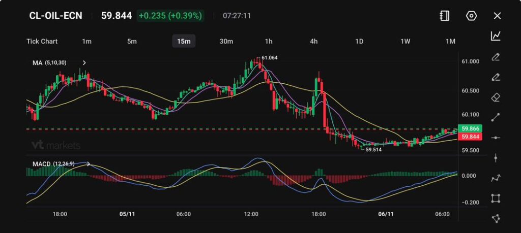 Grafik 15 menit menunjukkan harga berkonsolidasi di atas level dukungan $59,50, dengan indikator momentum menunjukkan pemulihan ringan.