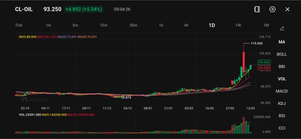 Minyak mentah WTI (CL-OIL) diperdagangkan di sekitar $93.25, naik 5.54%, saat harga memantul setelah koreksi tajam dari lonjakan ke $119.43. Pasar stabil di atas level $90 setelah volatilitas (naik-turun harga yang cepat) minggu lalu, menandakan pembeli mencoba kembali mendorong harga naik setelah kenaikan cepat lalu penurunan.