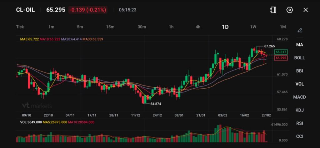WTI saat ini diperdagangkan di sekitar $65,30, bertahan di atas rata-rata pergerakan jangka pendek (moving average/MA, yaitu rata-rata harga dalam beberapa hari terakhir untuk melihat arah tren):