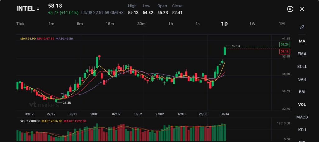Saham Intel melonjak saat pelaku pasar kembali masuk ke saham semikonduktor dan mencari nama yang lebih jelas terhubung dengan infrastruktur AI (perangkat keras dan sistem yang dipakai untuk menjalankan AI). Saham naik 11% ke 58,18, sempat menyentuh tertinggi harian 59,13, dan ditutup jauh di atas penutupan sebelumnya 52,41.