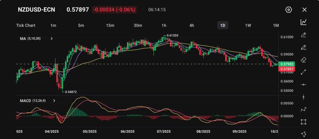 Dollar Selandia Baru (NZDUSD) terus mengalami kesulitan, diperdagangkan pada 0.57897, turun 0.06%, dengan pergerakan harga yang condong bearish saat pasangan tersebut meluncur lebih jauh di bawah 0.58.