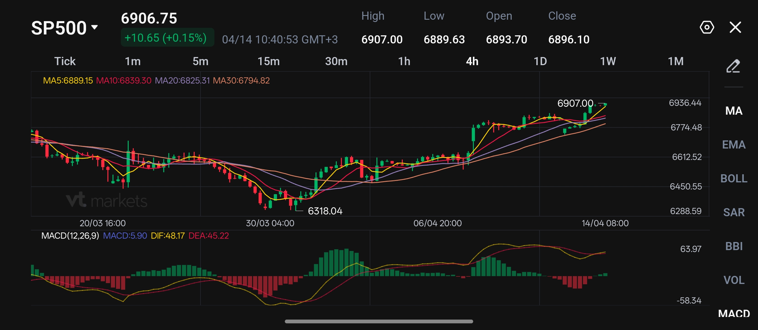 Indeks membentuk titik terendah lokal (local bottom, yaitu titik rendah sementara sebelum harga naik lagi) dekat 6318,04 pada 30 Maret. Sejak itu, arahnya naik secara konsisten, ditandai puncak yang makin tinggi dan dasar yang makin tinggi. Harga saat ini 6906,75 berada sedikit di bawah puncak terbaru 6907,00, menandakan pasar sedang menguji area tahanan terdekat (resistance, yaitu level harga yang sering sulit ditembus karena banyak yang menjual).