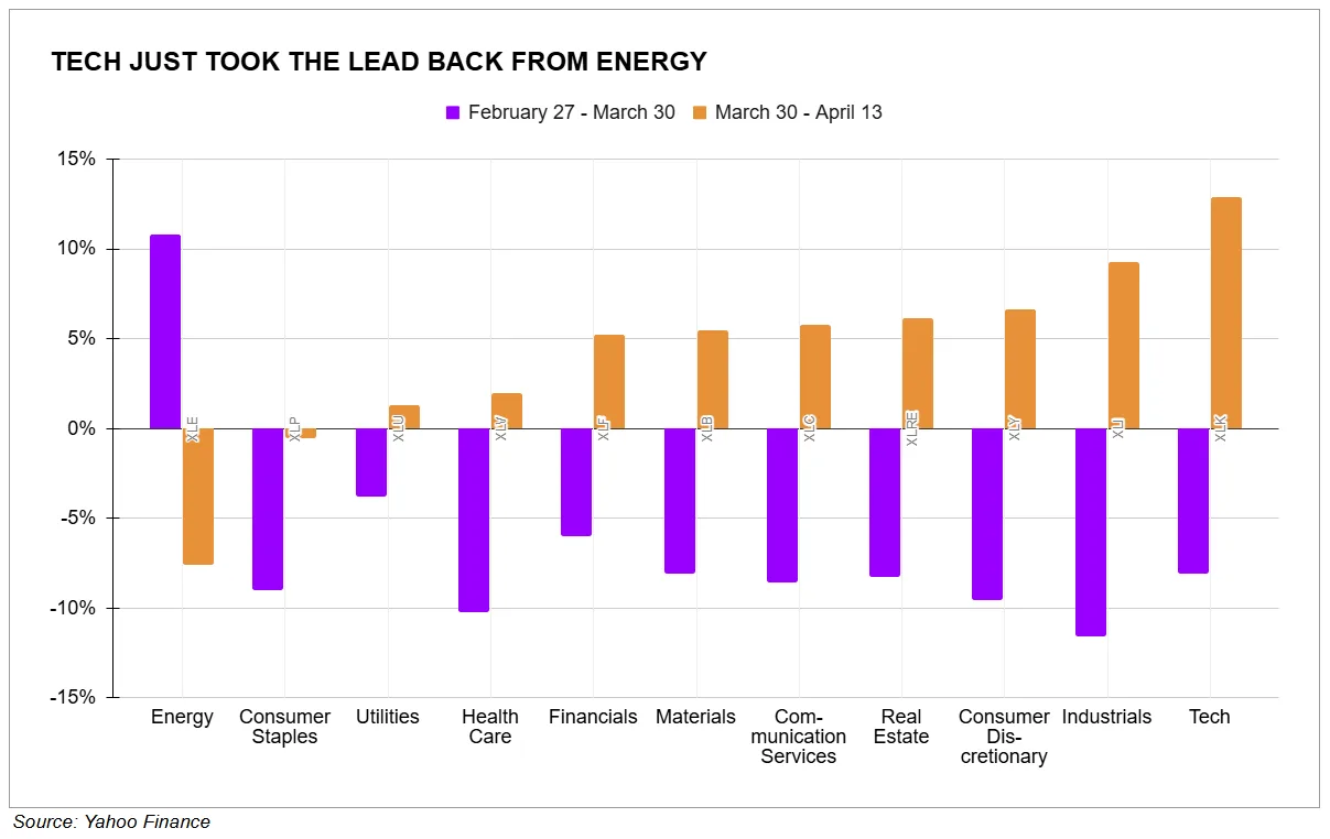 Grafik di bawah menunjukkan pergeseran kinerja sektor: saham teknologi melonjak sejak 30 Maret, sementara saham energi mulai menurun. Ini menegaskan teknologi yang sebelumnya tertinggal sekarang memimpin pasar.