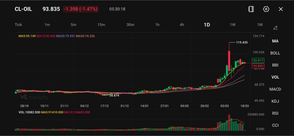 Minyak mentah (CL-OIL) diperdagangkan di sekitar $93,83, turun sekitar 1,47% pada sesi ini, karena pasar berhenti sejenak setelah kenaikan agresif yang mendorong harga ke puncak terbaru di sekitar $119,43.