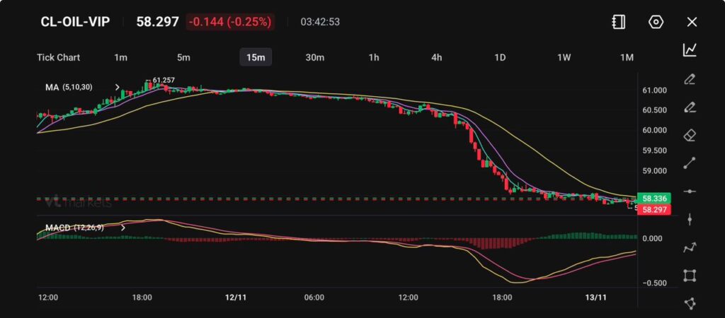 Harga minyak mentah telah jatuh ke $58.29, melanjutkan penurunan tajam selama intraday dari puncak sekitar $61.26 saat momentum negatif dominan.