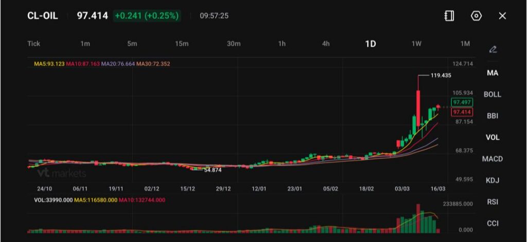 Minyak mentah WTI (CL-OIL, kode instrumen untuk kontrak minyak WTI) diperdagangkan di sekitar $97,41, naik tipis pada sesi ini. Pasar masih konsolidasi (bergerak dalam kisaran sempit) setelah lonjakan tajam yang mendorong harga mendekati $119,43. Setelah lonjakan itu, pergerakan harga stabil di kisaran pertengahan $90, menandakan pasar mencoba membentuk keseimbangan baru setelah volatilitas ekstrem (naik-turun harga yang sangat cepat) pada awal bulan.