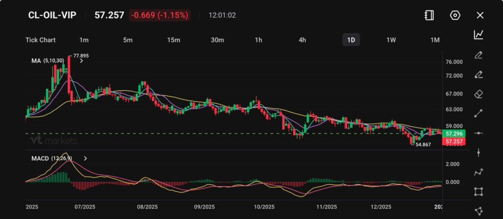 Gambaran pasokan yang lebih luas terus membebani minyak. Kelebihan pasokan yang berkepanjangan mendorong harga ke kinerja tahunan terlemah dalam beberapa tahun, dengan minyak mentah Brent turun 18% pada tahun 2025.