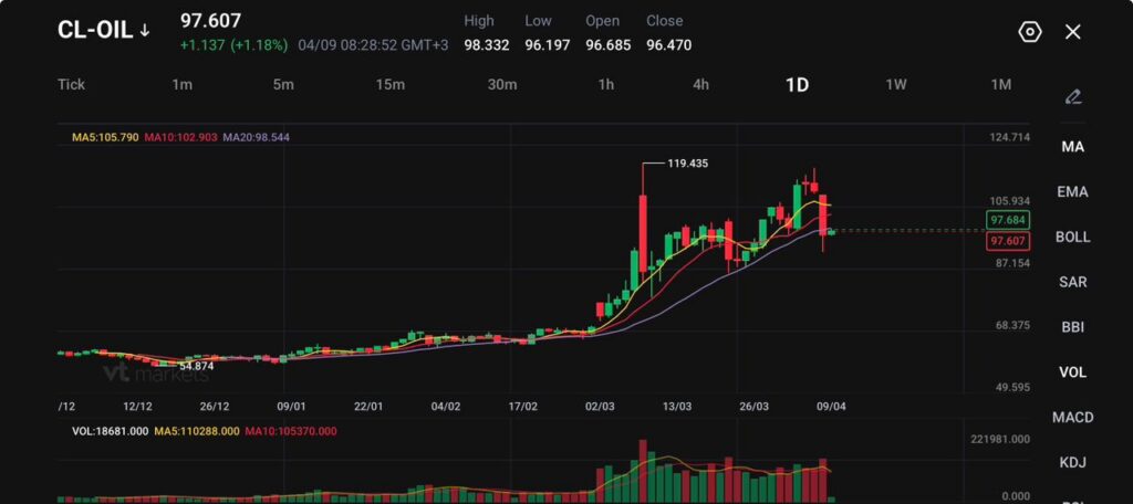 • CL-OIL diperdagangkan di 97,607, naik 1,137 (+1,18%), setelah sempat menyentuh tertinggi 98,332 dan terendah 96,197.