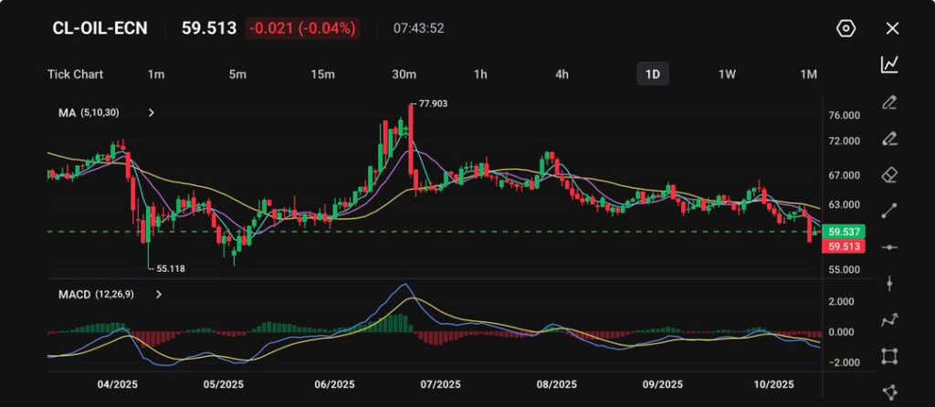 Minyak mentah (CL-OIL) saat ini diperdagangkan sekitar $59,51, sedikit turun sebesar 0,04%, saat harga mengalami konsolidasi di dekat level terendah lima bulan di tengah kekhawatiran tentang permintaan global yang melambat dan ketahanan pasokan yang berkelanjutan dari produsen besar.