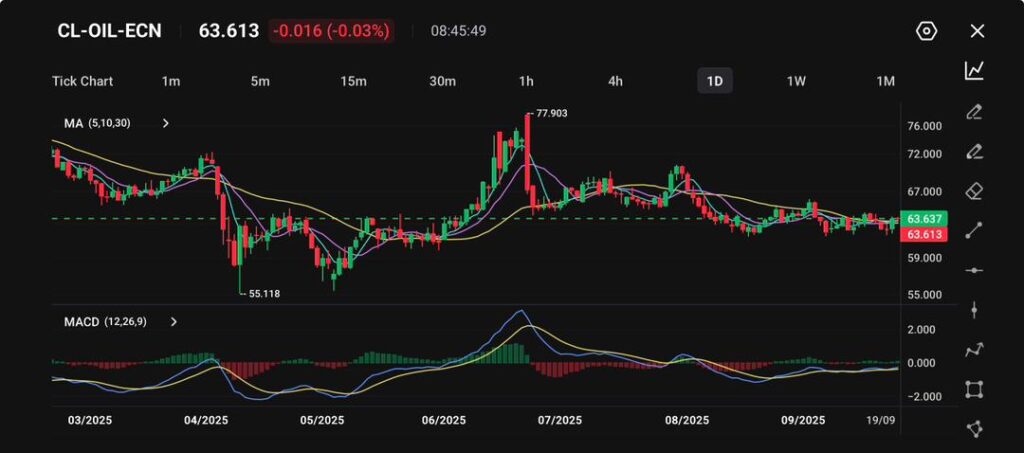 Minyak mentah (CL-OIL) diperdagangkan pada $63.61, turun 0.03% hari ini, menunjukkan konsolidasi setelah tahun yang bergejolak. Harga jatuh tajam hingga level terendah $55.11 pada bulan April, sebelum melonjak menjadi $77.90 pada bulan Juli, hanya untuk kembali turun ke kisaran 60-an.