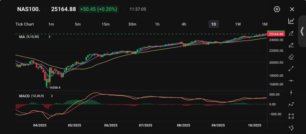 Indeks Nasdaq 100 (NAS100) diperdagangkan sekitar 25,164.88, naik 0.20% pada hari ini, sementara saham teknologi terus menunjukkan ketahanan meskipun ada kehati-hatian di pasar yang lebih luas.