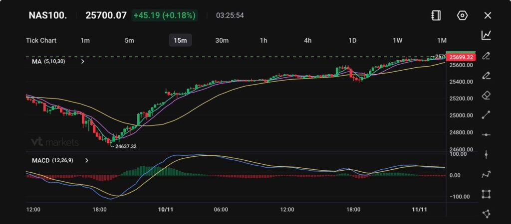 Nasdaq 100 (NAS100) diperdagangkan sekitar 25,700, melanjutkan kenaikan stabil saat saham teknologi terus pulih dari koreksi singkat minggu lalu.