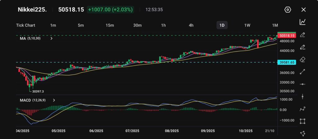 Nikkei 225 melanjutkan lonjakan kuatnya pada hari Senin, melonjak 2,03% untuk ditutup di 50.518,15, menandai pergerakan pertamanya yang bertahan di atas ambang psikologis 50.000. Kenaikan indeks ini didorong oleh kekuatan luas di sektor teknologi dan keuangan, dengan sentimen investor didorong oleh yen yang lebih lemah dan optimisme tentang kondisi pertumbuhan global yang membaik.