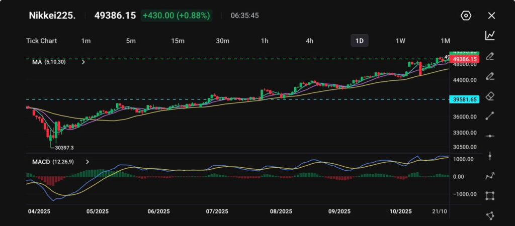 Nikkei 225 melonjak 0.88% untuk ditutup di 49,386.15, didorong oleh sentimen positif di pasar Asia. Para trader menyambut baik laporan pendapatan perusahaan yang positif dan nilai yen yang lebih lemah, yang membantu sektor-sektor yang sedang berkembang.