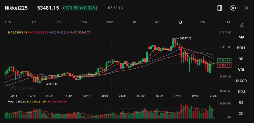 Nikkei 225 Jepang melonjak pada Rabu, naik 2,93% ke 53.784,43, setelah pasar merespons turunnya harga minyak dan tanda bahwa ketegangan geopolitik (konflik antarnegara yang memengaruhi pasar) bisa mereda.