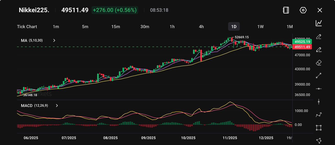 Nikkei 225 sedang mengonsolidasikan di dekat 49.511, naik 0,56% hari ini, mempertahankan struktur bullish secara keseluruhan meskipun terjadi perlambatan momentum sejak puncak November di 52.669.