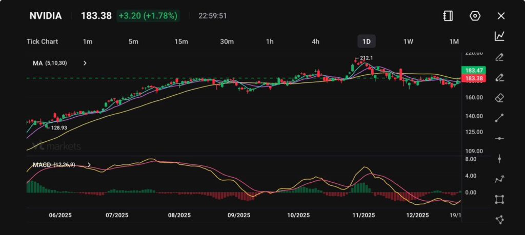 NVIDIA mengalami pemulihan kecil setelah periode penurunan yang stabil dari puncak November 212.1. Saham saat ini berusaha untuk mendapatkan momentum positif, diperdagangkan sedikit di bawah resistensi jangka pendek di 183.47.