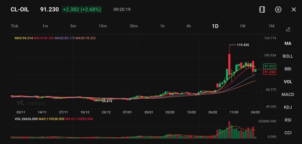 - WTI diperdagangkan di sekitar 91,23, naik +2,382 (+2,68%), sementara Brent memantul lagi di atas $100 per barel.