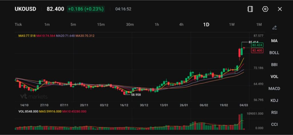 Harga minyak tetap tinggi, dengan UKOUSD (Brent) diperdagangkan di dekat US$82,40, bertahan dekat level puncak setelah lonjakan kuat dari titik terendah Desember sekitar US$58,96. Pola pergerakan harian menunjukkan tren naik yang jelas, didukung rangkaian puncak yang lebih tinggi dan titik terendah yang lebih tinggi sejak awal tahun (tanda harga cenderung terus naik).
