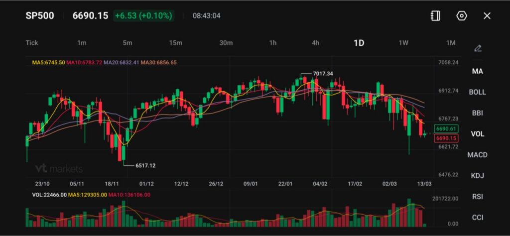 S&P 500 berusaha stabil, tetapi kondisi ekonomi makro (gambaran besar ekonomi seperti inflasi, suku bunga, dan pertumbuhan) makin tidak mendukung. Pasar kini menyesuaikan diri dengan kemungkinan perang di Timur Tengah lebih lama, harga minyak bertahan di sekitar $100 per barel, dan inflasi yang sulit turun.