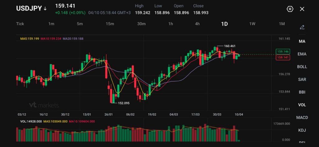 Yen cenderung stabil, belum menguat tegas. USDJPY diperdagangkan di 159,141, menunjukkan turunnya harga minyak membantu, tetapi terbatas.