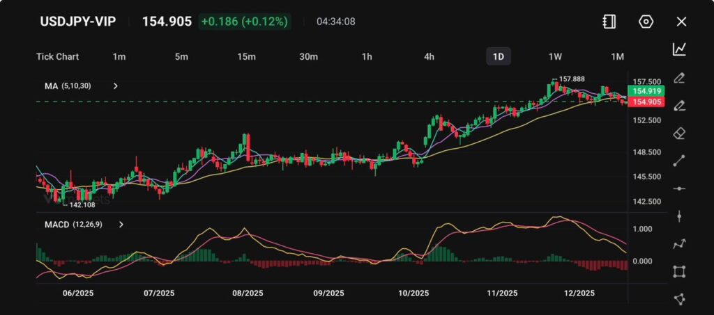 USDJPY saat ini berada di atas 154.90, naik 0.12% pada hari ini, tetapi pergerakan harga tampak melambat setelah gagal menguji ulang puncak 157.89 yang dicapai awal bulan ini.