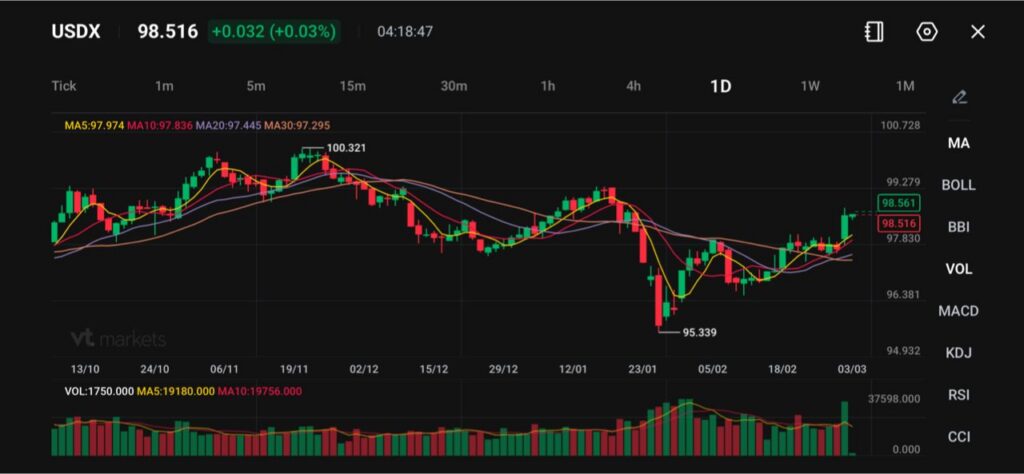 Indeks Dolar AS (USDX) diperdagangkan di dekat 98,52, sedikit lebih tinggi pada sesi ini, karena dolar stabil setelah memantul dari level terendah Januari 95,34. Struktur yang lebih luas menunjukkan fase pemulihan setelah penurunan tajam pada pertengahan musim dingin.