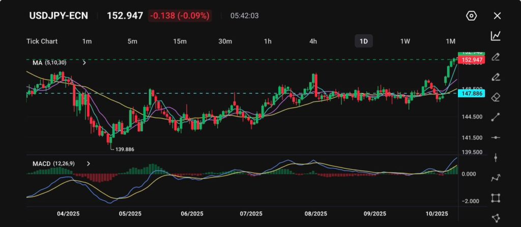 Pasangan USD/JPY diperdagangkan sekitar 152.95, sedikit lebih rendah 0.09%, tetapi masih berada dekat level tertinggi tahun ini karena yen melemah di bawah kekuatan dolar AS yang terus-menerus.