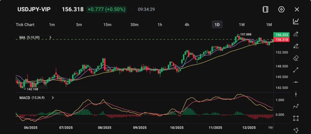 USDJPY diperdagangkan pada 156.31, naik 0.50% intraday, ketika pihak pembeli mulai mendapatkan momentum kembali setelah penurunan singkat dari puncak 157.88 yang tercatat pada akhir November.