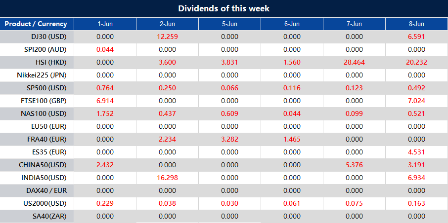 Please note that the dividends of the following products will be adjusted accordingly. Index dividends will be executed separately through a balance statement directly to your trading account, and the comment will be in the following format “Div & Product Name & Net Volume ”.