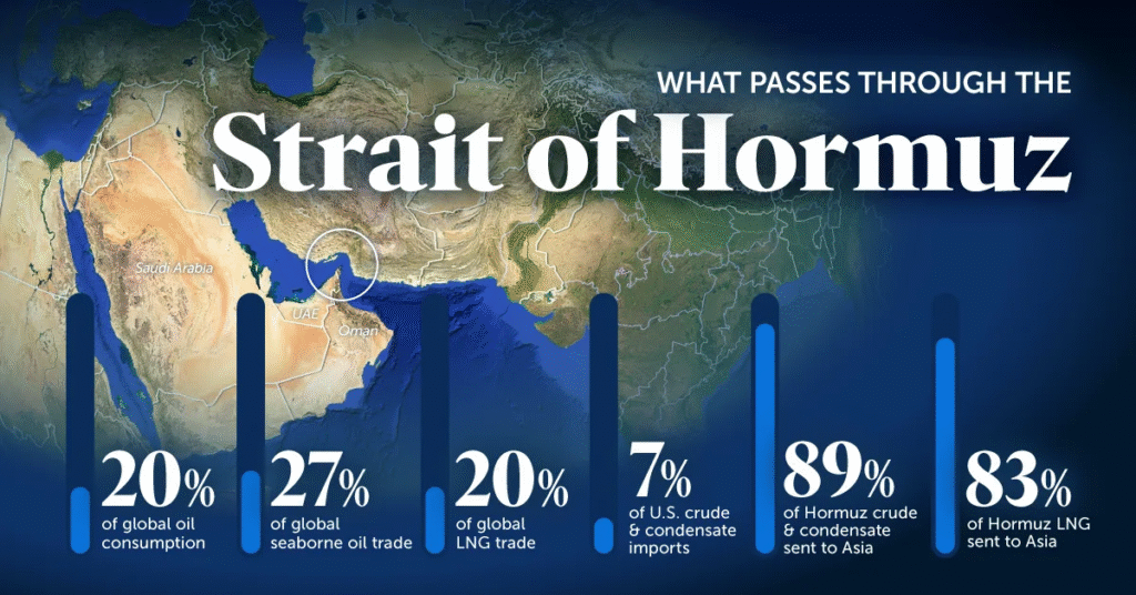 Selat Hormuz menangani sekitar 20% konsumsi minyak dunia, juga bagian besar arus gas alam cair/LNG (Liquefied Natural Gas: gas yang didinginkan hingga cair agar mudah diangkut), terutama dari Qatar. Gangguan di sini membuat harga cepat menyesuaikan, bukan bergerak pelan.