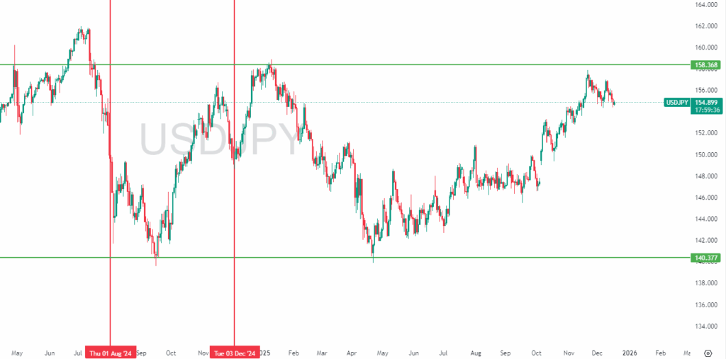 Pada Agustus 2024, USD/JPY jatuh menuju level 141, memicu likuidasi paksa di seluruh posisi perdagangan carry berleverase. Namun, proses itu belum sepenuhnya tuntas. Ekonomi AS tetap tangguh, selisih suku bunga tetap lebar, dan trader kembali melakukan perdagangan saat Yen melemah lagi.