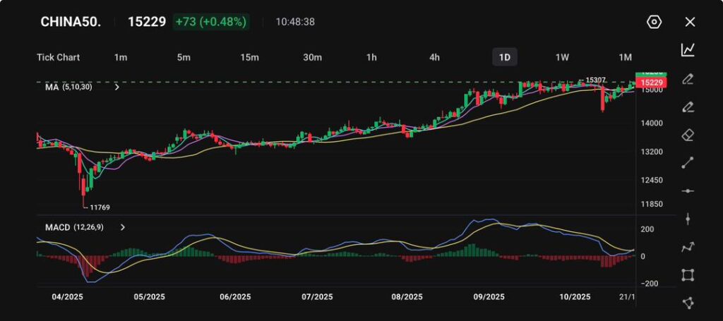 Indeks China A50 (CHINA50), yang melacak 50 perusahaan daratan terbesar yang terdaftar di bursa, mengalami kenaikan tajam pada awal Oktober ke level tertinggi dalam beberapa tahun, mencerminkan optimisme investor yang diperbarui, sebelum sedikit mundur setelah ancaman tarif baru dari Washington.