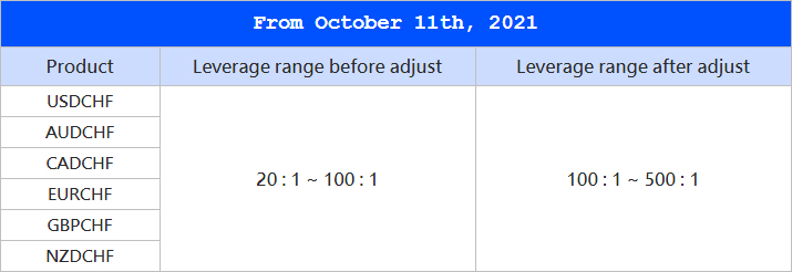 VT Markets holds the spirit of dedicating ourselves to providing the most competitive trading environment in this industry. As the risk of trading CHF pairs gradually stabilizes, VT Markets will raise the leverage range of CHF pairs on Oct. 11, 2021.