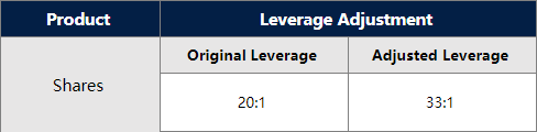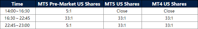 2. 20 Pre-market US Shares on MT5: Leverage will be 5:1 during 14:00-16:30 and 22:45-23:00; and remain 33:1 during the rest of the trading time.