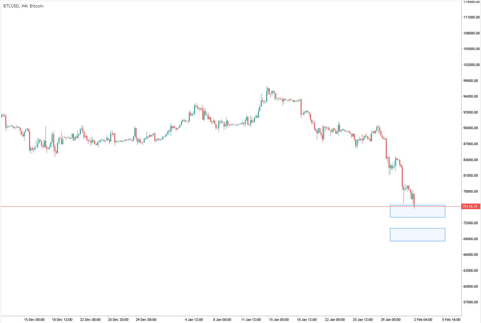 • Jika level support saat ini tembus, kemungkinan besar harga akan mencari level support di $70.000.