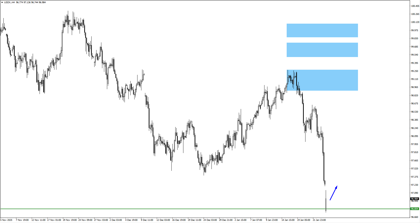 - USDX terus diperdagangkan lebih rendah dari area 98,70 dan telah menembus 96,804.