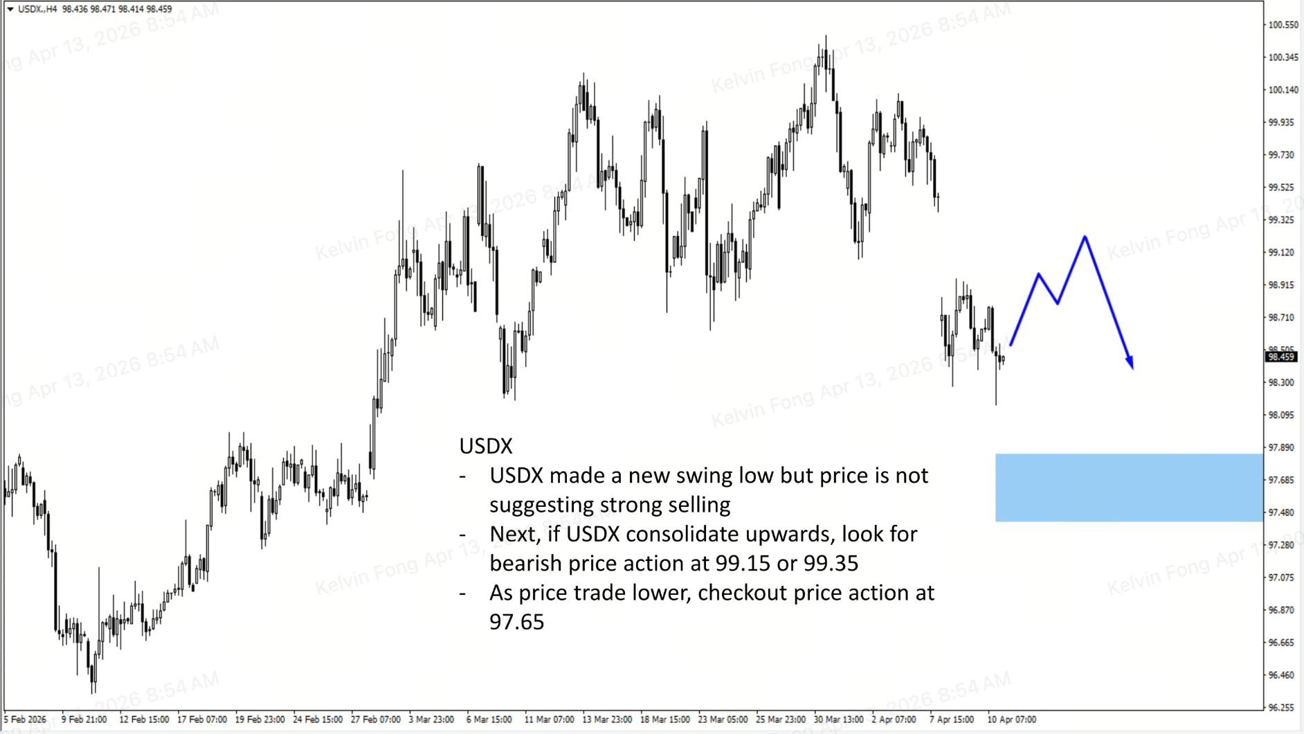 • Dolar naik dengan loncatan harga (gap up: harga pembukaan langsung lebih tinggi dari penutupan sebelumnya) menuju level 99 karena investor beralih ke aset aman.